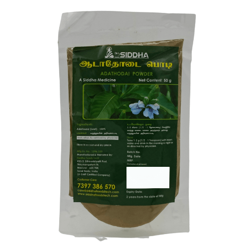 Adathodai Powder is an effective natural remedy for relieving coughs, colds, and throat infections. It helps soothe the throat, clear mucus, and reduce irritation, providing relief from persistent coughing and congestion.