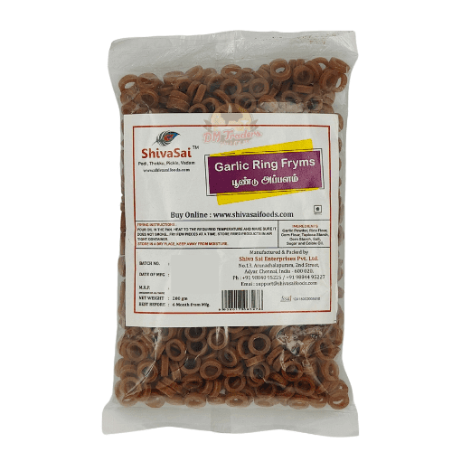 Ideal as a snack on their own or as a side dish with rice, sambar, or rasam, Garlic Ring Fryums add a flavorful twist to your meal. The garlic not only enhances the taste but also provides health benefits like boosting immunity and aiding digestion, making this snack both tasty and healthy.